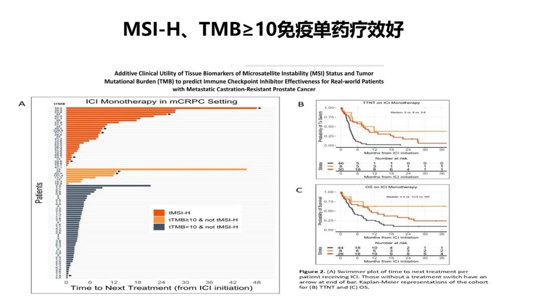 陈教授指出,目前免疫治疗药物在mCRPC未筛选的患者群体中疗效欠佳,但最新的ASCO研究证实,在MSI-high或TMB≥10的特殊人群中,免疫治疗单药疗效明显优于化疗。因此,对于具有MSI-high或高TMB特征的mCRPC患者,精准选择并积极应用免疫治疗具有重要意义。