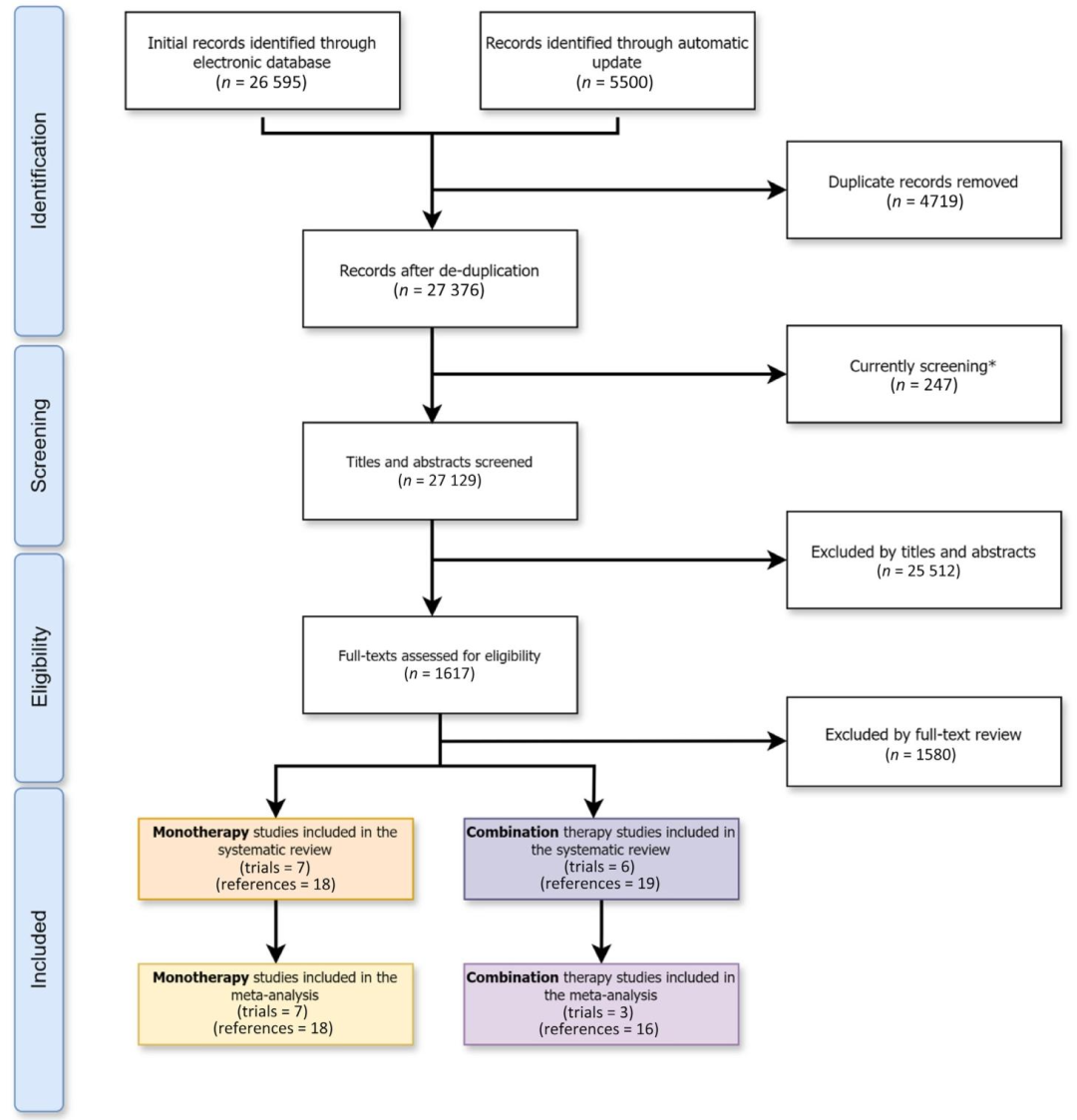 通过MEDLINE和EMBASE数据库检索从建库开始至2021年6月16日的文献,关键词包括“PARP抑制剂”“mCRPC”“HRR基因突变”等,并通过“监测模块”每周自动更新文献。纳入标准为评估PARPi单药治疗经治mCRPC或联合ARPI治疗初治mCRPC的临床试验,初治定义为未接受过mCRPC系统治疗或治疗后进展者。经标题、摘要及全文筛选,最终纳入13项试验(4278例患者),其中7项为单药研究,6项为联合治疗研究。