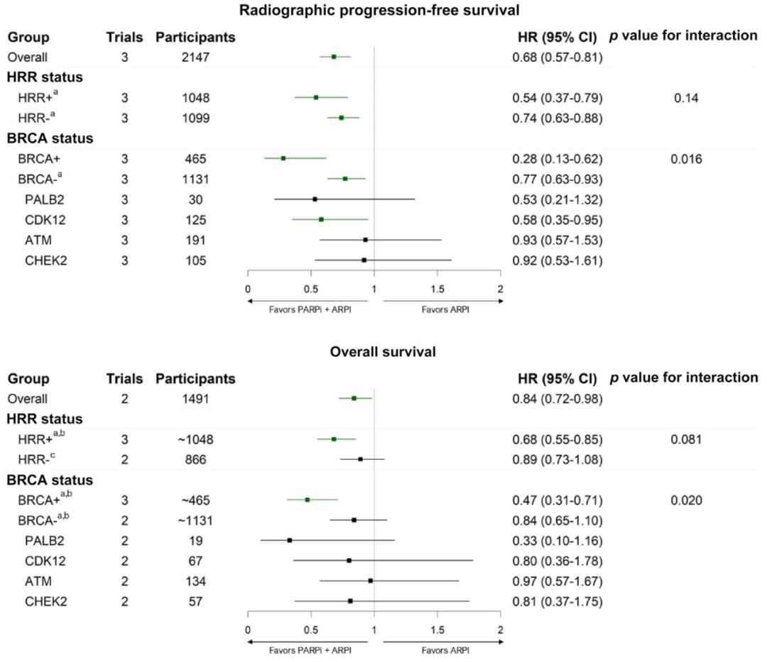 这项动态交互式荟萃分析全面定量总结了PARPi在mCRPC中的治疗效果,包括一线与ARPI联合使用,或在经治疾病中作为后线单药治疗的情况。我们利用临床试验的最新证据提供了精确的疗效评估,对具有临床重要性的亚组进行了更强的统计分析——此前由于样本量有限,各独立试验对这些亚组的分析大多未得出明确结论。结果表明,参与HRR通路的基因在引发对PARPi治疗的响应方面并非等效。最易对PARPi产生响应的基因组改变存在于BRCA2、PALB2、BRCA1和CDK12基因。我们的发现超越了“HRR”与“非HRR”的一般性指导,为临床医生提供了关于PARPi使用的更具体信息。在指导mCRPC患者合理使用PARPi方面,基于特定基因的方法似乎是最佳选择。
