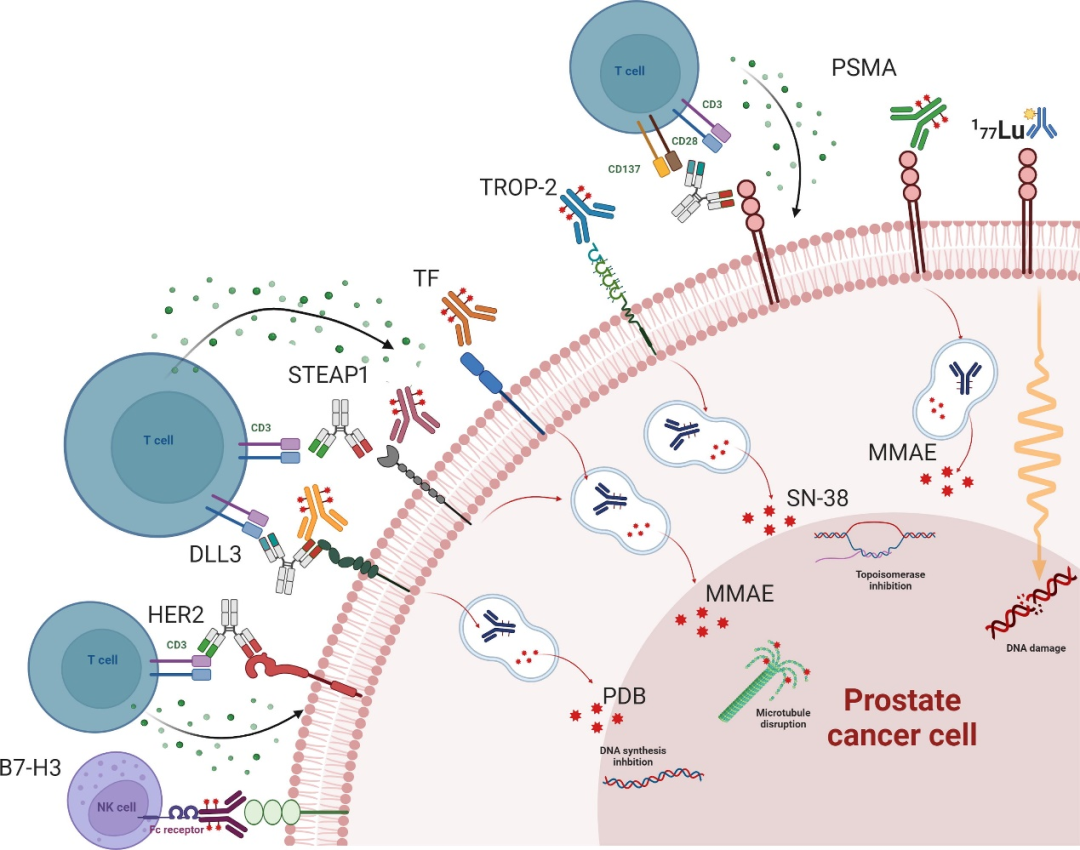 具体可分为靶向PSMA的放射性配体(177Lu-PSMA-617、225Ac-PSMA-617等),以及靶向前列腺癌细胞表面蛋白的抗体偶联药物,这些蛋白包括PSMA、滋养层细胞表面抗原2(Trop-2)、组织因子、前列腺六跨膜上皮抗原1、人表皮生长因子受体2和3、B7-H3、Nectin-4等。