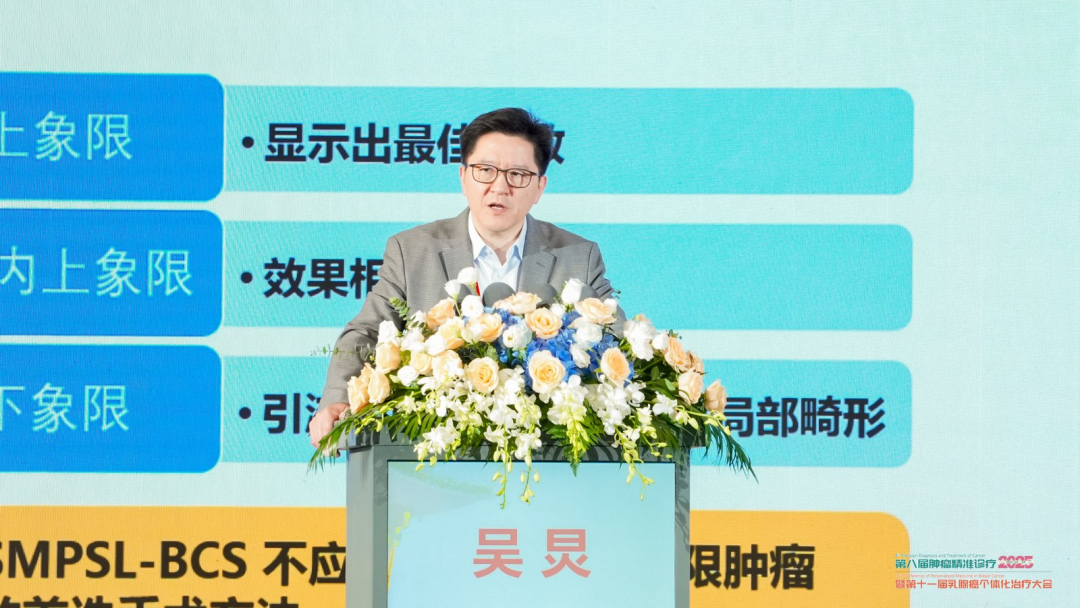 重庆医科大学附属第一医院任国胜教授、哈尔滨医科大学张清媛教授的主持下,复旦大学附属肿瘤医院吴炅教授带来了“乳腺癌保乳治疗的挑战与策略”的讲课,就我国乳腺癌保乳治疗现状、保乳手术切缘的安全性、美观性及相关问题的应对策略进行了详细介绍。
