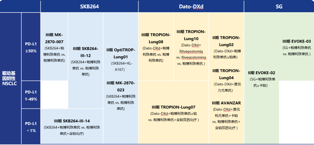 由于TROPION-Lung01和EVOKE-01研究分别发现单药Dato-DXd和戈沙妥珠单抗(sacituzumab govitecan,SG)都未显著改善经治的晚期NSCLC患者的总生存(OS)获益,研究人员开展联合方案的探索。
