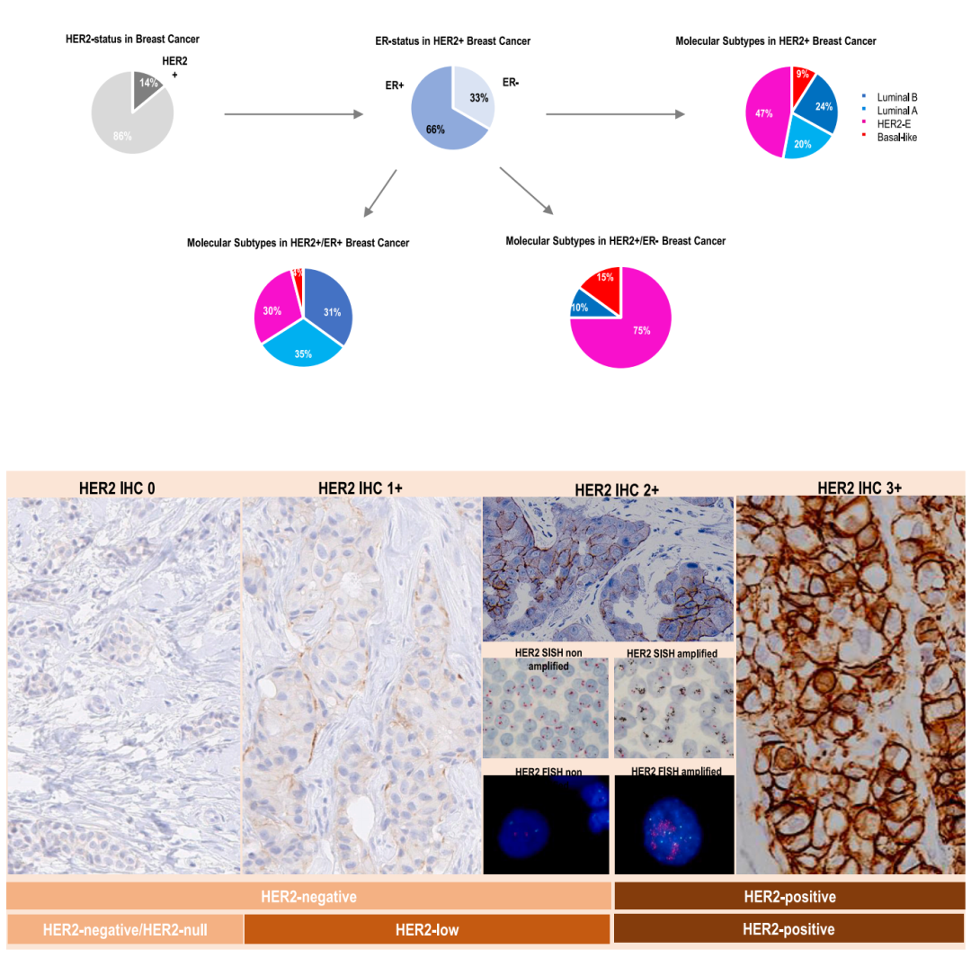 图1.HER2阳性乳腺癌的生物学和分子异质性(上图)以及乳腺癌中HER2表达的分类(下图)