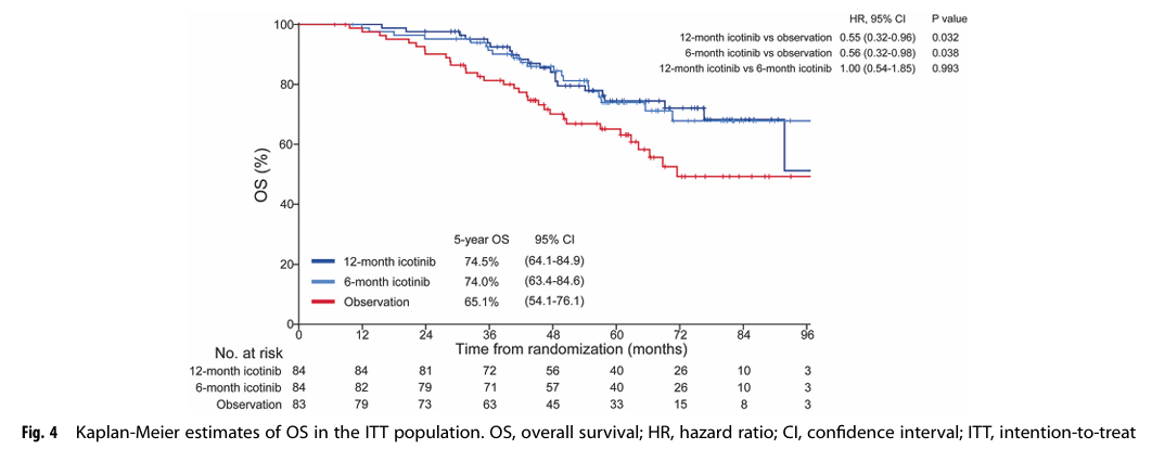 研究结果显示:1)无病生存期(DFS)显著改善:与观察组相比,埃克替尼治疗组(无论是12个月还是6个月)均显著延长DFS,12个月组中位DFS达到61.8个月,6个月组为63.2个月,远高于观察组的23.7个月,风险比(HR)分别为0.40和0.41,降低疾病复发或死亡风险近60%。