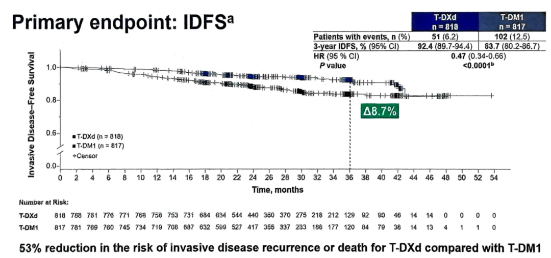 该研究主要终点显示,T-DXd较T-DM1将浸润性疾病复发或死亡风险(IDFS)显著降低53%(HR 0.47,95%CI 0.34-0.66,P<0.0001),T-DXd组的三年IDFS率为92.4%(95%CI:89.7–94.4),而T-DM1组为83.7%(95%CI:80.2–86.7),该IDFS获益结果在所有预设亚组中均保持一致。