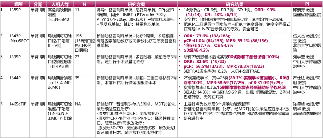 这5项替雷利珠单抗相关前瞻性临床试验涵盖了鼻咽、口腔、喉、下咽及舌部等多个亚瘤种,充分展现了围术期免疫治疗在提升病理缓解、器官功能保留和手术降阶方面的价值。这些研究的突破,有望切实改变局晚期头颈肿瘤患者的生存与生活质量,为头颈肿瘤领域的免疫治疗带来更多支持证据。