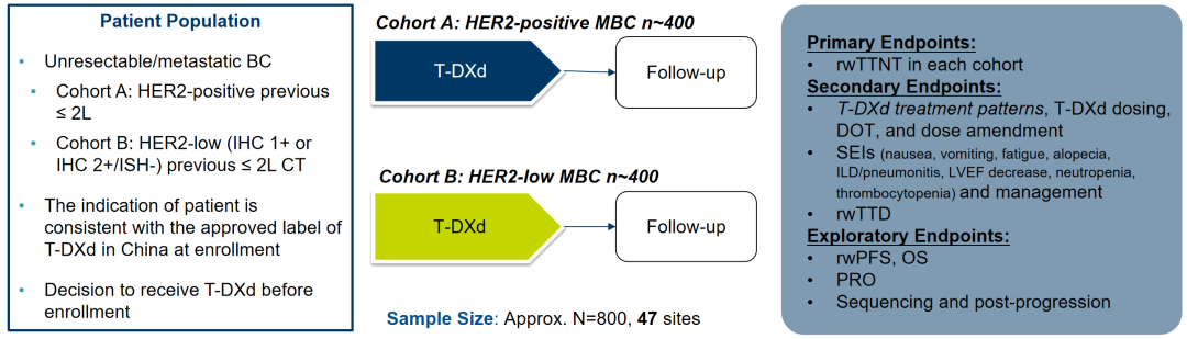 研究的主要终点为每个队列的真实世界至下一线治疗或死亡的时间(rwTTNT);次要终点包括T-DXd治疗模式、剂量、治疗持续时间(DOT)、剂量调整,医生报告的关注的安全性时间(SEIs:恶心、呕吐、疲乏、脱发、间质性肺疾病/非感染性肺炎、左心室功能不全)及其管理措施,真实世界至恶化时间(rwTTD)等;探索性终点涵盖真实世界PFS(rwPFS)、OS、患者报告结局(PRO)等。