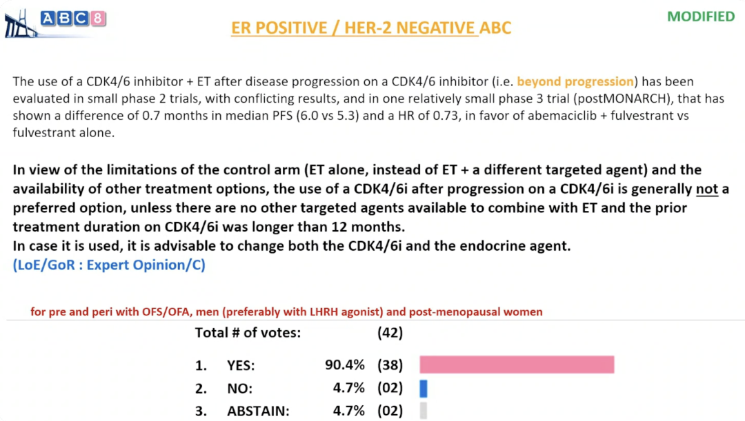鉴于该研究的对照组(单用内分泌治疗,而非内分泌治疗联合其他靶向药物)存在局限性,且目前已有其他治疗选择,因此在CDK4/6i进展后继续使用CDK4/6i通常并非优选方案。除非没有其他可与内分泌治疗联用的靶向药物可用,且既往使用CDK4/6i的疗程长于12个月。