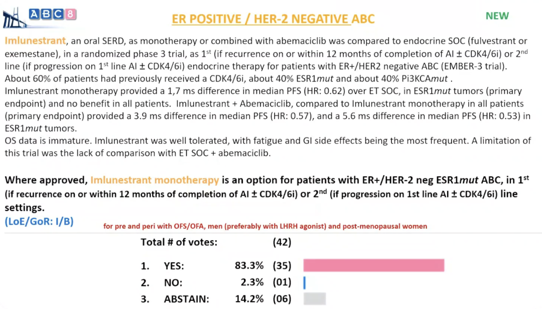 在随机III期试验(EMBER-3)中,对Imlunestrant(一种口服SERD)单药或与阿贝西利联合用药,与标准内分泌治疗(氟维司群或依西美坦)进行了比较。该试验针对ER+/HER2-晚期乳腺癌患者,用于一线(如果在完成AI±CDK4/6抑制剂治疗期间或完成后12个月内复发)或二线(如果在一线AI±CDK4/6抑制剂治疗期间进展)内分泌治疗。约60%的患者曾接受过CDK4/6抑制剂治疗,约40%携带ESR1突变,约40%携带PIK3CA突变。