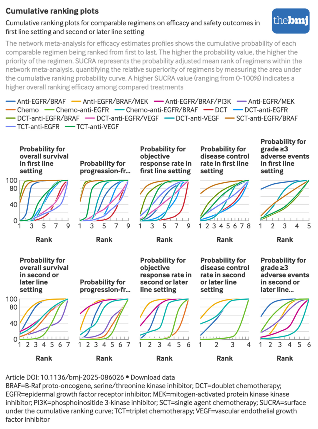 而通过一项研究解决上述问题的有效方法,就是整合所有BRAF突变肠癌研究数据进行网状荟萃分析。而通过一项研究解决上述问题的最佳也是唯一方法,就是整合所有BRAF突变肠癌研究数据进行网状荟萃分析,然而这项工作对数据规模和统计方法都提出了极高要求,同时面临模型架构复杂、统计验证层级多的技术瓶颈。为此,团队构建了目前样本量最大的BRAF突变晚期肠癌研究队列(涵盖4633例患者),创新性地采用三重研究模型——单臂荟萃分析、直接配对荟萃分析与间接网状荟萃分析相互印证,基于两个关键维度(一线治疗、二线及后线治疗)系统追踪评估五大临床终点(总生存期、无进展生存期、客观缓解率、疾病控制率与3级以上不良事件),全面解析不同治疗方案的疗效与安全性。