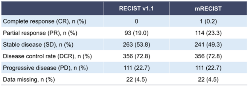 表2.经独立评审委员会(IRF)评估的诱导治疗阶段中,依据RECIST v1.1和mRECIST标准的ORR(N=489)