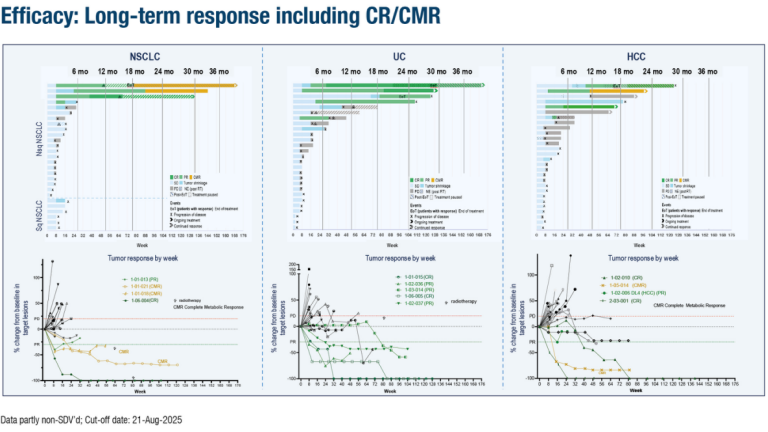 “更值得关注的是,这些患者的缓解深度,超过了他们初始接受的一线或二线ICIs治疗方案。”Romano博士强调。在缓解持续时间(DoR)方面,非鳞状NSCLC中位DoR达32.2个月,UC为28.8个月,HCC为19.4个月,且61.5%的应答仍在持续。安全性方面,该方案≥3级治疗相关不良事件(TRAE)发生率为10.6%,未出现严重危及安全的不良反应。