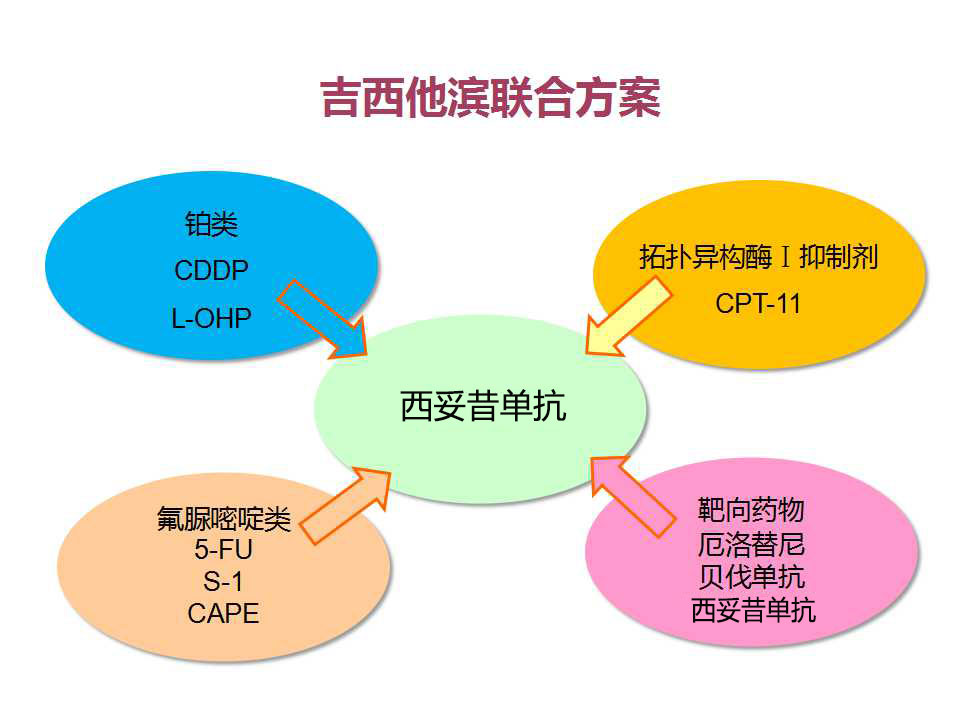 吉西他滨仍为晚期胰腺癌的基石。根据既往研究,吉西他滨单药治疗胰腺癌的有效率在5%-15%,中位生存期6个月左右,联合氟尿嘧啶类、铂类及拓扑异构酶抑制剂等有可能提高有效率,但未能提高远期生存,目前仅白蛋白紫杉醇联合吉西他滨对比吉西他滨单药用于转移性胰腺癌化疗的随机III期临床研究(MPACT)获得阳性结果(ASCO-GI Annal meeting 2013),联合后可以明显延长生存期。分子靶向药物在胰腺癌中未能有所突破,仅GEM+厄洛替尼比单药GEM有统计学上的差异,但生存获益甚微。Ⅱ期临床研究显示,GEM+尼妥珠单抗对K-ras野生型的胰腺癌及62岁以上的患者生存有获益,但尚有待进一步III期临床研究证实。