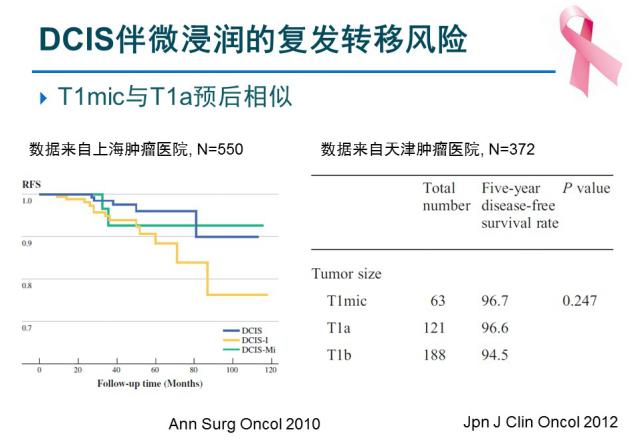对于DCIS伴微浸润的复发转移风险,来自上海肿瘤医院及天津肿瘤医院的数据显示T1mic与T1a的预后相似。DCIS伴微浸润的人群还分为不同的亚组, 有一项来自NCCN数据库的研究,研究人群为T1aN0M0的乳腺癌患者,其中T1a含T1mic,85%患者应用内分泌治疗,无化疗和抗HER2治疗,对于ER阳性HER2阴性(此处指浸润成分的免疫组化状态)的患者来说,它的5年DFS可以达到93%,而对于ER阳性HER2阳性的患者,它的5年DFS较低,仅为86%,似乎还有治疗的空间。那对于这样一类数量较少的人群,是否还需要继续治疗及如何治疗,在临床上只能应用相似的临床试验做配比。最知名也最相似的就是APT临床研究,APT临床研究入组的是HER2阳性、ER阳性或ER阴性,淋巴结阴性,且病灶≤3cm的患者,应用紫杉醇联合曲妥珠单抗1年,T1mic患者占2.2%,T≤1cm的3年DFS达到99.5%。虽然这个研究是目前最接近我们所想研究的微浸润肿瘤的前瞻性研究,但它的微浸润病例依然非常少,所以在实际临床工作中如何用药还是一个问题。