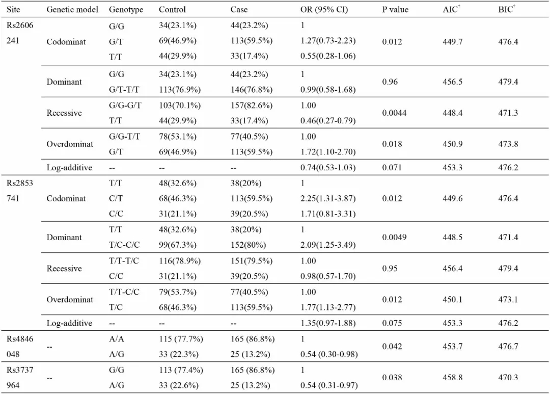 我们以χ2检验比较病例组(193例患HFS)和对照组(149例未患HFS)之间各等位基因和基因型分布的差异,发现阳性位点(P<0.05)是MTHFR基因的rs4846048(P=0.030)和rs3737964(P=0.029),以及TYSM基因的rs2606241(P=0.022)和rs2853741(P=0.019)位点。