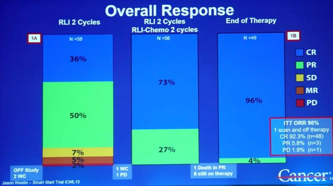 结论:Smart Start研究证明利妥昔单抗375 mg/m2,依鲁替尼560 mg和来那度胺25 mg的无化疗组合对新诊断的非GCB亚型 DLBCL患者非常有效。我们计划用其他新药进行进一步研究,并且对于RLI方案获得CR的患者,减少化疗巩固疗程。(高岩  翻译)