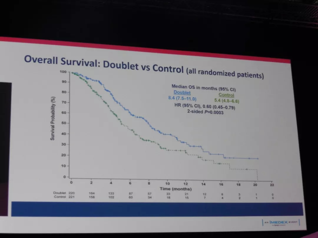而通过垂直抑制,我们可以在EGFR和BRAF水平的不同步骤阻断相关途径,并在MEK水平进一步阻断下游相关途径。几项小型Ⅰ期和Ⅱ期研究以及BEACON的前期研究已经证实了其有效性,该研究于今年发表在临床肿瘤学杂志上,结果非常令人鼓舞,48%在BEACON前期阶段接受治疗的患者表现出缓解率和15.3个月的中位总生存期。BEACON CRC研究的完整数据在本次会议上报告。我们知道,接受三联疗法(binimetinib,encorafenib和西妥昔单抗)的患者中位总生存期为9个月,而对照组为5.4个月。就EGFR抑制剂西妥昔单抗和BRAF抑制剂encorafenib的双药联合结果而言,与对照组5.4个月的总体生存率相比,双药联合组的总体存活率为8.4个月,略低于三联疗法。因此,三联疗法似乎略微优于双联疗法,但我们仍需要通过更多的后续研究来探索毒副作用。总之,我们第一次看到针对BRAF V600E突变的个性化治疗在低风险BRAF突变的患者中带来了实际的生存获益。