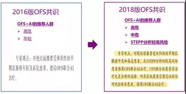 2018版OFS共识与2016版相比,OFS联合AI的推荐人群由高危 “更新” 为高危和中危,或STEPP分析较高风险者。