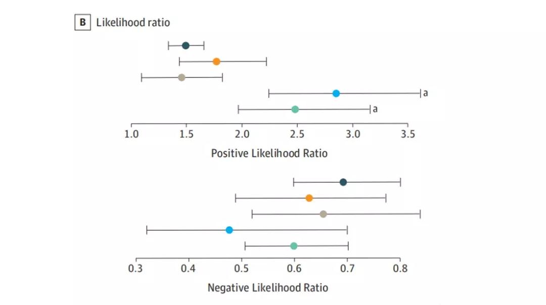 该研究主要检测综合受试者工作特征曲线(sROC曲线)以及曲线下的面积(AUC)并且汇总灵敏度、特异性、阳性和阴性预测值(PPV,NPV)以及每种测定方式的阳性和阴性似然比(LR+和LR-)。