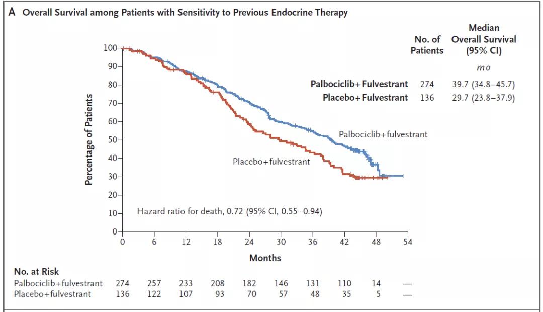 PALOMA-3研究纳入521例绝经前/围绝经期/绝经后既往内分泌治疗进展的HR+/HER2-晚期乳腺癌患者,随机2:1分配至氟维司群+palbociclib和氟维司群+安慰剂组。主要研究终点是PFS;次要终点是OS/ORR/CBR/患者报告/安全性;2015年新英格兰公布了PFS数据;palbociclib联合氟维司群显著延长PFS(9.2月vs 3.8月;HR=0.42;95%CI:0.32-0.56;P<0.001);2018年同样在新英格兰公布了其OS数据;palbociclib联合氟维司群较单药组延长6.9月(34.9月vs28.0月;HR=0.81,95%CI:0.64-1.03;P=0.09);虽然总人群中OS数据未取得差异,但将近7个月的临床绝对获益确实值得关注。另外亚组分析发现,之前对内分泌敏感的人群,联合组较单药组OS绝对获益10个月,且有统计学意义(39.7月vs29.7月;HR=0.72,95%CI:0.55-0.9;P=0.0081),而且联合组较单药组推迟了后续接受化疗的时间(HR=0.58,95%CI:0.47-0.73;P<0.001)。