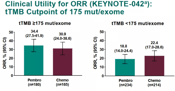KEYNOTE-042研究中,在tTMB≥175 mut/exome的患者中,帕博利珠单抗组和化疗组的中位OS分别为21.9个月和11.6个月(HR=0.62;95%CI: 0.48~0.80);中位PFS分别为6.3个月和6.5个月(HR=0.75;95%CI: 0.59~0.95);两组的ORR分别为34.4%和30.9%。在tTMB<175 mut/exome的患者中,帕博利珠单抗组和化疗组的中位OS分别为12.0个月和12.3个月(HR=1.09;95%CI: 0.88~1.36);中位PFS分别为4.1个月和6.3个月(HR=1.27;95%CI: 1.04~1.55);两组的ORR分别为18.8%和22.4%。