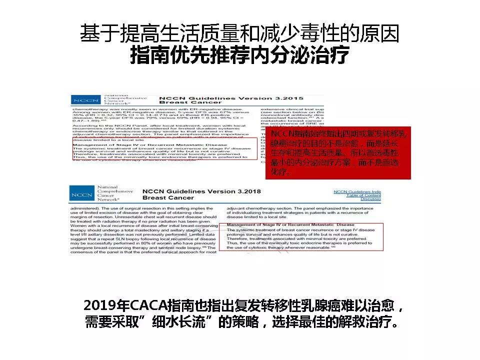 总体而言,我们应该意识到临床上确实有一类人是属于原发性耐药,尽管其为激素受体阳性患者,但她对内分泌治疗就是不敏感。就像我刚才比喻的她虽然具备女性性征但对男性并不感兴趣一样,但目前用时间cut-off值来定义虽有其局限性,但有一定的临床参考价值。其次,因为存在上述局限性,所以临床确实会存在误判。患者在两年之内出现复发我们判定为原发性耐药,两年毕竟是一个人为的定义,可能患者对内分泌治疗相对比较敏感,联合靶向治疗后是可以逆转的,所以我们还是要谨慎思辨。第三,临床上对原发性内分泌耐药患者要根据其复发转移出现的时间、转移的部位、肿瘤负荷、HR表达状态进行“辨证论治”,不宜一概化疗。这种“辨证论治”思维不仅是医学的艺术魅力所在,也是医生存在的价值所在。