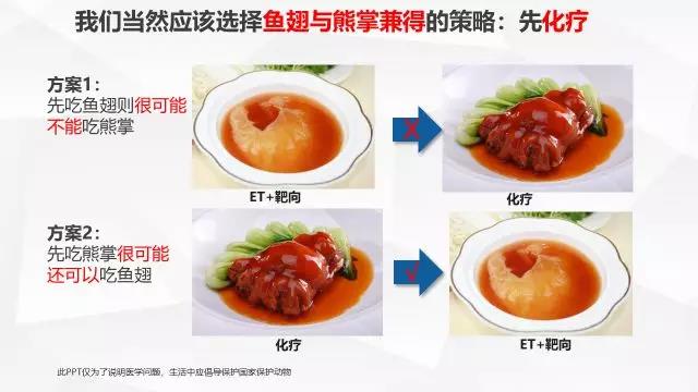 “龟兔赛跑”、“鱼翅和熊掌兼得”,这是我在大会辩论时打的另两个比喻,用以说明原发性内分泌耐药应该优选化疗。