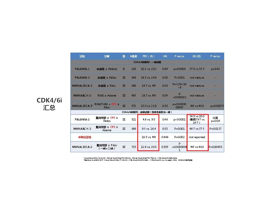 自“新贵”靶向药物的出现,许多临床试验都证实了PFS,甚至是OS的改善。从PFS来讲,BOLERO-2证实在整体人群和亚组人群当中,对mTOR抑制剂在内分泌原发耐药和继发耐药的获益是一致的,所以不能忽视对内分泌原发耐药人群用靶向治疗来逆转耐药的可能性。对于CDK4/6抑制剂,PALOMA-3等研究也使得我们看到了在原发或继发性耐药的患者当中其PFS获益趋势是一致的结论(交互检验不显著),只不过由于样本量较小而没有获得原发耐药亚组统计学上显著差异。