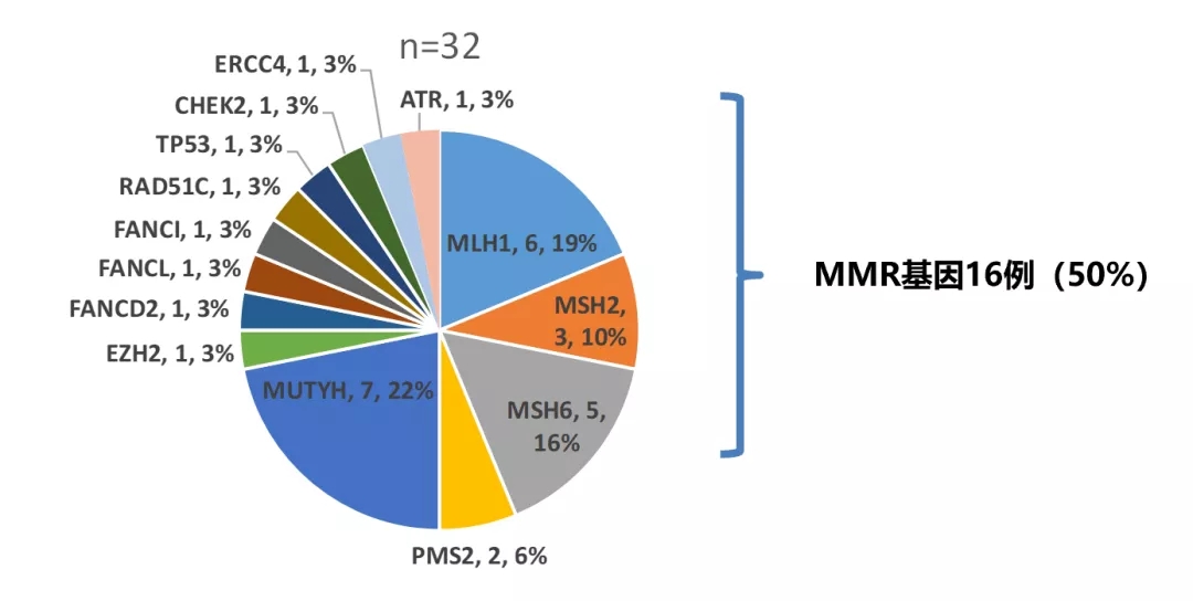 研究意外发现:一例患者为MMR基因纯合性突变,也称为结构性错配修复缺陷(constitutional mis-match repair deficiency, CMMRD)。该患者为结肠脾区粘液腺癌伴腹膜转移,查体提示背腹部多发散在斑点(牛奶咖啡斑)和结节(神经纤维瘤),但具体发生年龄未知。肿瘤家族史方面,其爷爷73岁患胃癌,姥姥43岁患子宫内膜癌,其两女出生时都带有青色胎记。患者本人发现MSH6p.R1076C位点的纯合突变,为其一级亲属行基因检测,最后证实其父母、两个女儿均存在MSH6p.R1076C的杂合突变。其父母均体健,调查家族史后证实父母为近亲结婚。