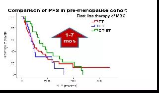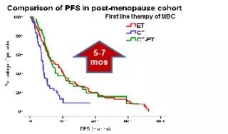 约70%的患者处于绝经后状态(ET:76.6%,CT:75.5%,CT-ET:68.9%)。在绝经后人群中,内分泌组(15.1个月,95%CI:10.6~19.7)及化疗序贯内分泌组(13.6个月,95%CI:9.3~17.8)的中位PFS显著优于化疗组(8.0个月,95%CI:7.0~9.0)。但在绝经前人群中,化疗序贯内分泌组的中位PFS(16.6个月,95%CI:9.9~23.3)显著优于内分泌组(10.1个月,95%CI:6.3~13.9)及化疗组(9.1个月,95%CI:6.3~12.0)。