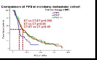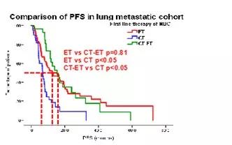在肺转移人群中,内分泌组(13.1个月,95%CI:5.1~21.1)和化疗序贯内分泌组(15.4个月,95%CI:9.2~21.6)的中位PFS显著优于化疗组(6.9个月,95%CI:6.1~7.7)。在非肺转移组内,内分泌组和化疗序贯内分泌组的中位PFS同样优于化疗组,分别为:14.4个月(95%CI:10.1~18.6),13.7个月(95%CI:10.3~17.1)及8.7个月(95%CI:6.8~10.6)。