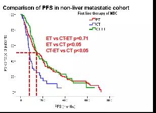 研究结果:研究中,内分泌治疗组(ET)、化疗组(CT)、化疗序贯内分泌组(CT-ET)的中位年龄相似,分别为:54.9岁(53.5岁~56.3岁),52.2岁(50.0岁~54.2岁),52.8岁(50.7岁~54.9岁)。化疗组中内脏转移的比例较其他两组更高,(CT组vs.ET组、CT-ET组:70.2%vs.41.5%,45.9%,P=0.000012)。月经状态等其他一般资料在三组之间分布无明显差异。