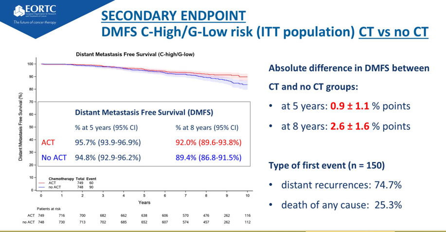 这项研究的一个次要终点是化疗或不化疗对cH/gL患者的影响。随访5年时显示化疗与不化疗的5年DMFS率绝对差是1.5%,随访8年时达到了2.6%,5年间差异进一步增加了0.9%。此外,我们进行了一个探索性研究,发现这部分患者中50岁以上的、绝经后女性,给予化疗和不给予化疗的差异并不大,仅为0.2%,但对于50岁以下的、绝经前的Luminal型女性,这一差异则显著高达5%。我们认为这一差异并非来源于化疗本身对肿瘤的细胞毒性作用,而应该是化疗对卵巢功能的抑制作用。