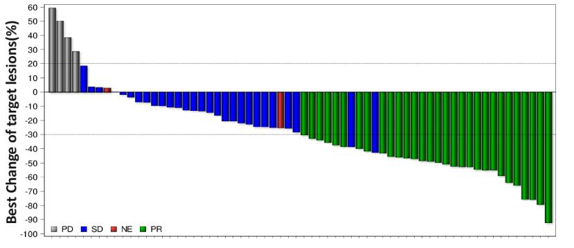 结果发现,独立评审委员会评估的ORR为46%,研究者评估的ORR为56%,基于组织和外周血检测的评估结果不存在较大差异。独立评审委员会评估的结果和研究者评估的结果,分别有89%和88%的患者出现肿瘤缩小,多数患者在接受治疗后6周以内出现。
