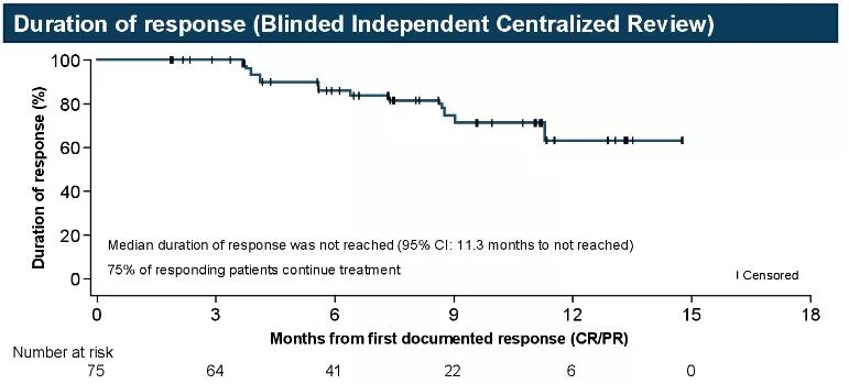 独立评审委员会评估的中位治疗持续时间为11.1个月,PFS为8.5个月;数据分析时,35%的患者停止Tepotinib治疗。中位OS为17.1个月;在11例有脑转移的患者中,独立评审委员会评估的ORR为55%,反应持续时间为9.5个月,PFS为10.9个月。