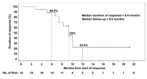 基于MRI或CT检查结果,这项研究共纳入79例入组时有中枢神经系统转移的患者,22例患者脑转移病灶可测量,14例患者有足够的随访时间。患者中位年龄为64岁,既往均接受过系统治疗,5例患者既往接受过颅脑放疗。14例患者的颅内ORR率高达93%,包括2例CR患者,中位反应持续时间为10.1个月。