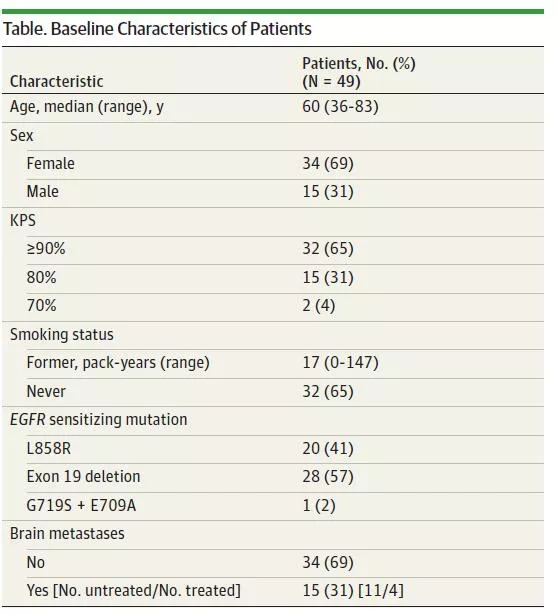 自2016年8月至2018年5月,共有49例患者入组,其中I期患者有6例,基于I期反爬坡的研究结果,II期患者均接受奥希替尼和贝伐珠单抗的全剂量治疗 (80 mg,口服,每日一次和15 mg/kg,每3周一次)。患者中位年龄60岁,21L858R和19del的比例分别为41%和57%,31%的患者携带脑转移(图1)。
