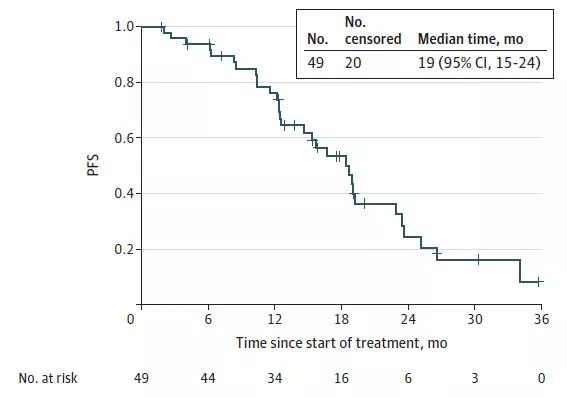 研究发现,患者12个月PFS率为76%,中位PFS为19个月,19例患者疾病进展后接受后续治疗,其中5例患者进展后继续接受原有治疗,并显示了临床获益。