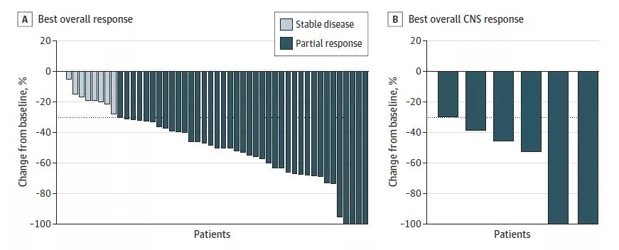 图3. 全组患者和无脑转移患者接受治疗后的瀑布图