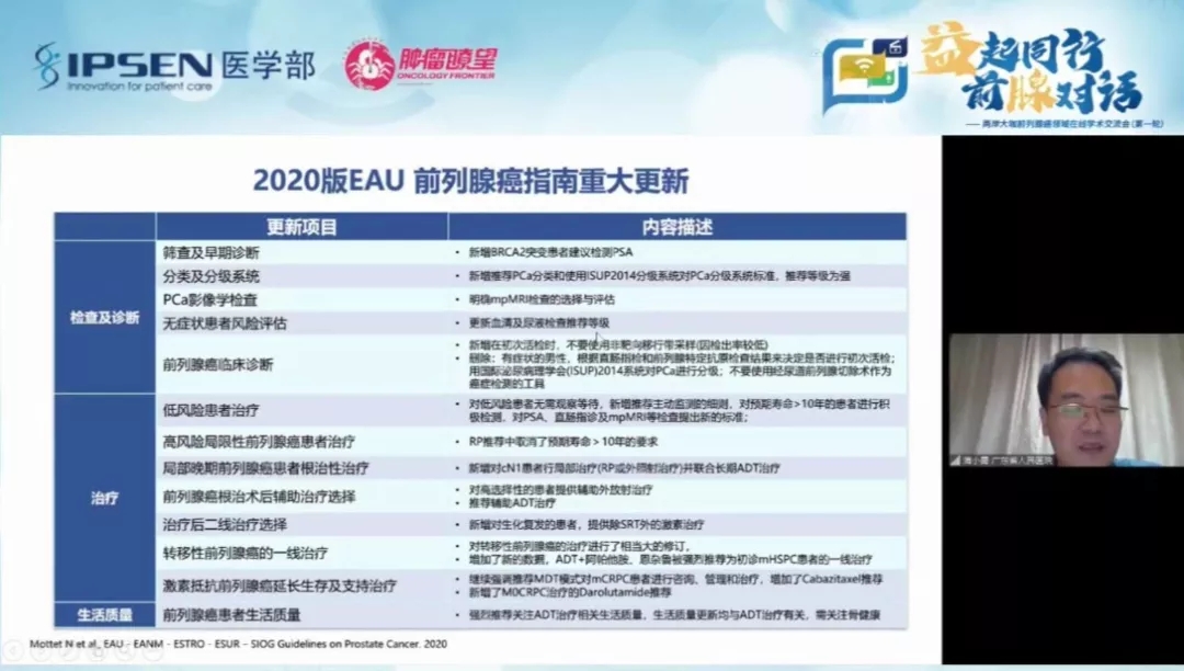 编者按:疫情之下,肿瘤患者的健康尤其值得关注。2020年6月17日,中山大学附属肿瘤医院泌尿外科主任周芳坚教授、副主任医师李永红教授以及广东省人民医院泌尿外科副主任医师蒲小勇教授与中国台湾大学医学院附设医院泌尿外科医师黄昭渊教授 “空中连线”,就前列腺癌局部治疗以及2020 EAU前列腺癌指南更新展开深入交流。《肿瘤瞭望》带您详细品读。