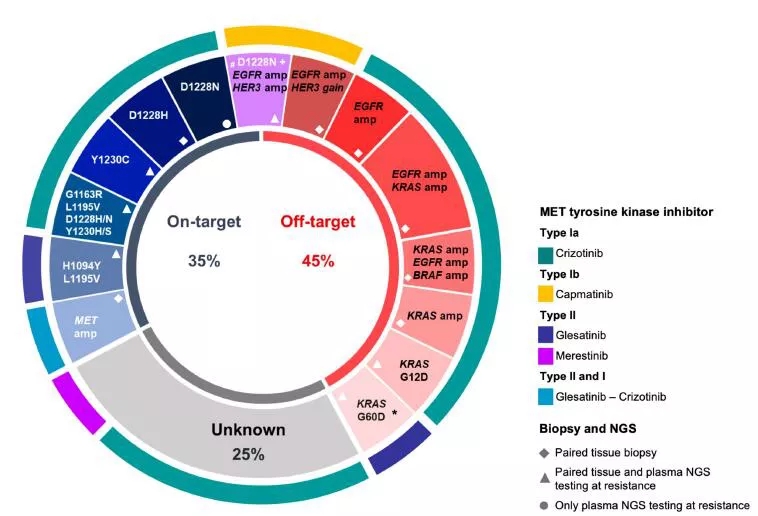 这项研究共纳入20例患者,在疾病进展时采集外周血或组织标本进行二代测序。研究发现,75%的患者携带已知或可疑耐药机制。继续依赖于MET通路的耐药机制和旁路激活机制分别为35%和45%,前者包括酪氨酸激酶域H1094、G1163、L1195、D1228和Y1230等点突变和MET扩增,后者包括KRAS、EGFR、HER3以及BRAF突变等。