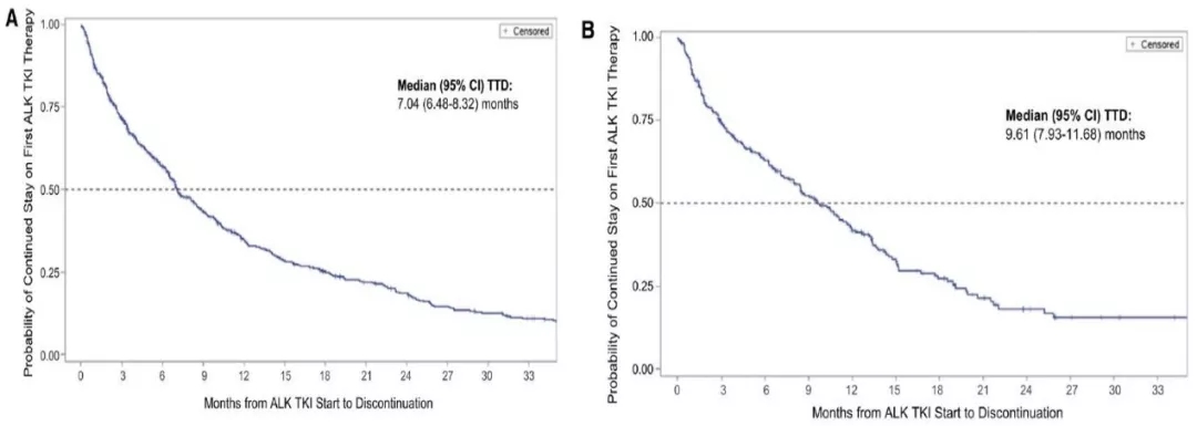 这项研究共纳入581例一线接受ALK-TKI(27.5%的患者有脑转移)及254例后线接受ALK-TKI治疗(45.7%的患者存在脑转移)的患者。84.6%的患者一线接受克唑替尼治疗,克唑替尼耐药后,分别有49.6%、41.7%、5.9%和2.8%的患者接受色瑞替尼、阿来替尼、克唑替尼再挑战及布格替尼治疗。在真实世界中,一线及二线的PFS分别为7.47个月和7.30个月。无脑转移和有脑转患者一线接受ALK-TKI治疗后的PFS分别有8.52个月和4.97个月,差异有统计学意义(P<0.001)。