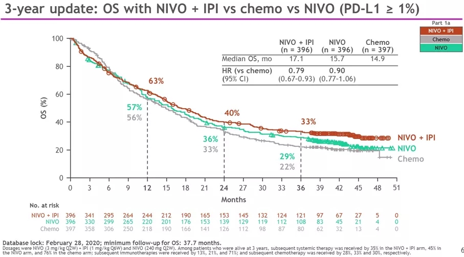 从2020 ASCO发布的CheckMate-227的3年随访数据可以看出,无论PD-L1表达阳性还是阴性,双免疫方案的获益均优于化疗。甚至,PD-L1<1%患者组从双免治疗中的获益度比PD-L1≥1%组更大。