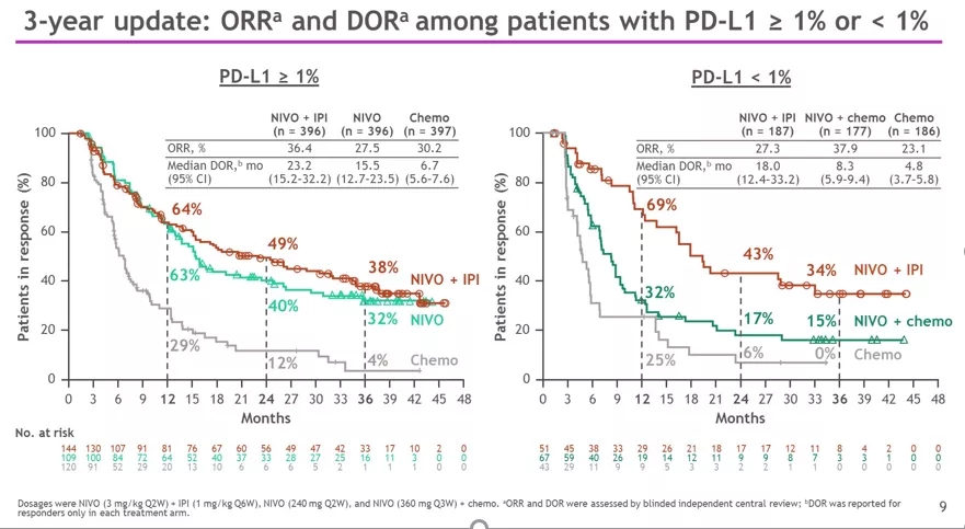 双免疫方案的疗效更持久:在PD-L1≥1%患者中,双免疫组和化疗组的中位DoR分别为23.2个月 vs. 6.7个月,双免疫组的缓解持续时间接近2年!PD-L1<1%患者中,中位DOR分别为18个月 vs. 4.8个月。在双免疫组和化疗组,确认治疗有效的患者中,3年后仍有治疗反应的比例分别为38% vs. 4%(PD-L1≥1%)和34% vs. 0%(PD-L1<1%),体现了免疫治疗的获益具有长拖尾效应;