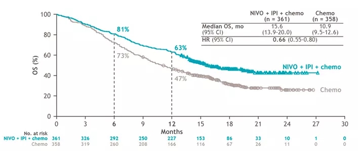 缓解持续时间增三倍:双免疫组的中位DOR达到了18个月,领先了于化疗组(4.8个月)三倍以上,双免疫方案的疗效相比化疗更佳持久。