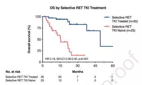 基线分析时,31%的患者有脑转移,92%的患者接受系统治疗。接受以铂类药物和培美曲塞为基础的化疗后,患者的ORR和PFS分别为54%和7.7个月。免疫联合或不联合化疗的中位PFS和ORR分别为3.7个月和29%。多靶点RET-TKI治疗后的PFS和ORR分别为3.3个月和15%,选择性RET-TKI治疗后的PFS和ORR分别为13.0个月和58%。仅有1例患者接受免疫联合化疗后出现客观反应,全组患者的中位OS为37.7个月。