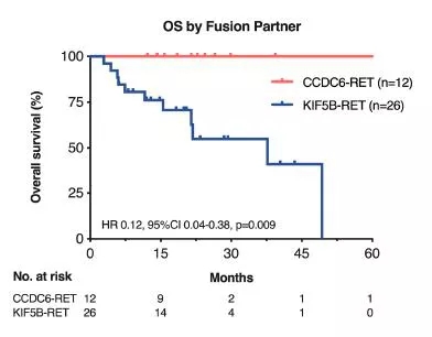 进一步分析发现,不同融合伴侣对患者预后存在影响。融合伴侣为CCDC-6的患者,中位OS达到113.5个月,优于非CCDC-6融合患者的37.7个月 (HR=0.12,P=0.009) (图4)。
