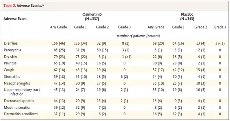 安全性:共计680例患者纳入安全性分析,奥希替尼组和安慰剂组分别有337例和343例,两组分别有98%和89%的患者出现任何级别的不良反应,其中3度及以上不良反应发生率为20%和13%,分别有16%和12%的患者出现严重相关不良事件,无致死性事件出现,两组分别有24%和11%的患者因不良反应导致治疗中断,分别有9%和1%的患者因不良反应导致剂量降低,分别有11%和3%的患者因不良反应导致治疗终止(图6)。