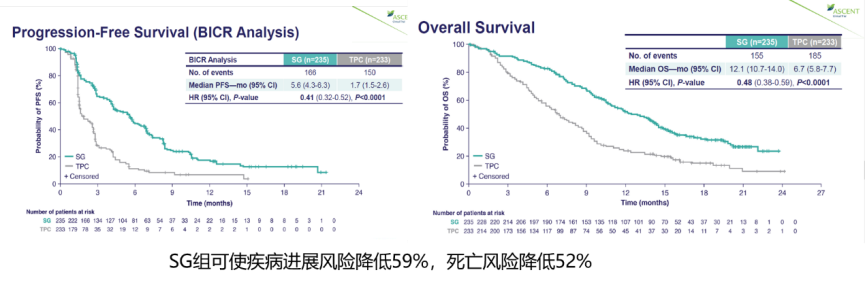 ASCENT是首个验证靶向Trop-2的ADC药物(sacituzumab govitecan [SG])用于经治mTNBC的III期临床研究。结果显示相比标准单药化疗,SG对患者获益有显著提高:中位PFS 5.6m 对比 1.7m(HR 0.41,P<0.0001);中位OS 12.1m对比 6.7m(HR 0.48,P<0.0001);ORR为35%对比5%。SG的耐受性良好,AE导致的治疗中断较低(4.7%)。