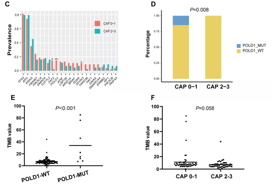 POLD1以及POLE突变多次被报道与免疫治疗超进展有关,在本研究中,发现POLD1、FAT2和ZFHX3突变的患者,病理缓解状况更好,其中8位携带POLD1突变患者中,6位达到ypCR,2位达到ypCAP1。此外,携带POLD1突变患者的肿瘤突变负荷(TMB)较高,并且ypCAP 0-1亚组的TMB要比ypCAP 2-3亚组高,表明POLD1突变及TMB-H可能是预测nCRT疗效的潜在指标。